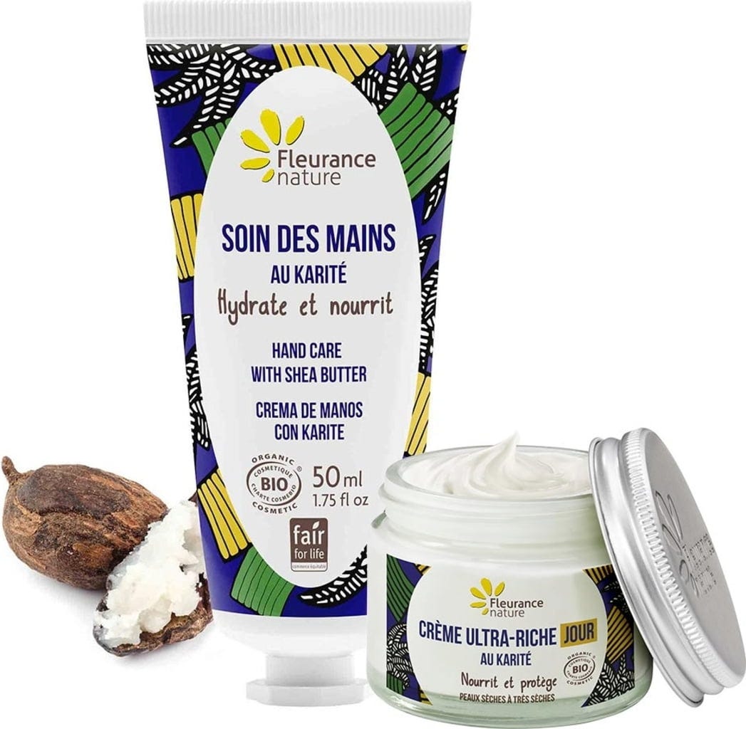 Poklon set sa shea maslacem sadrži dva posebno bogata proizvoda za njegu: dnevnu kremu i kremu za ruke. Ono što izdvaja njihove formulacije je iznimno visok udio hranjivog shea maslaca iz poštene trgovine. Sastojak se smatra tajnom ljepote u podsaharskoj Africi, a ima zaštitna i hranjiva svojstva. Shea maslac za ove proizvode dolazi iz zadruge u Burkini Faso, gdje žene skupljaju shea orahe i koriste ih za izradu dragocjenog maslaca.