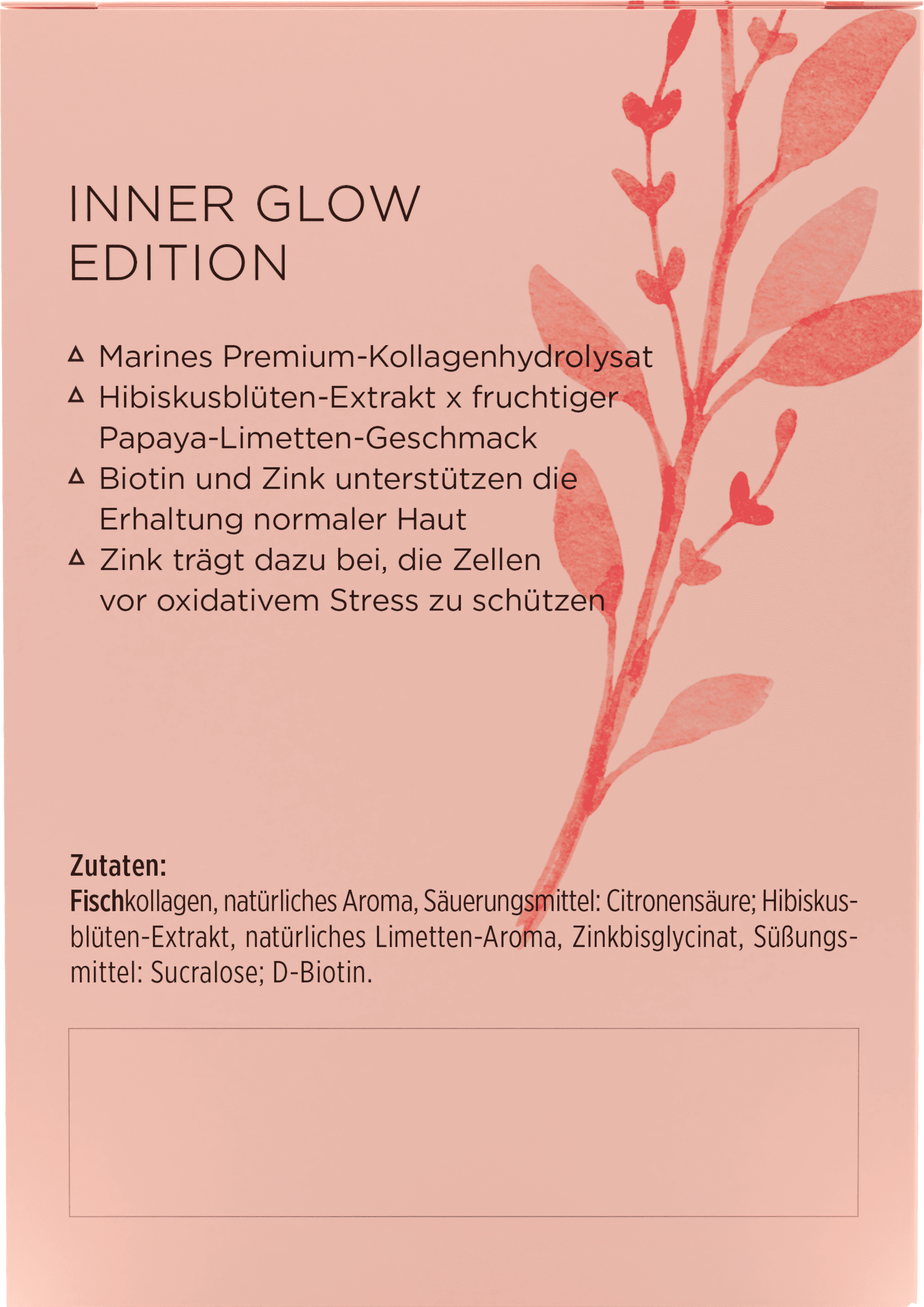 Riblji kolagen, natürliches Aroma, Zitronensäure (E330), ekstrakt cvjetova hibiskusa, prirodni okus limete, Cinkov bisglicinat, Sucralose, D-biotin