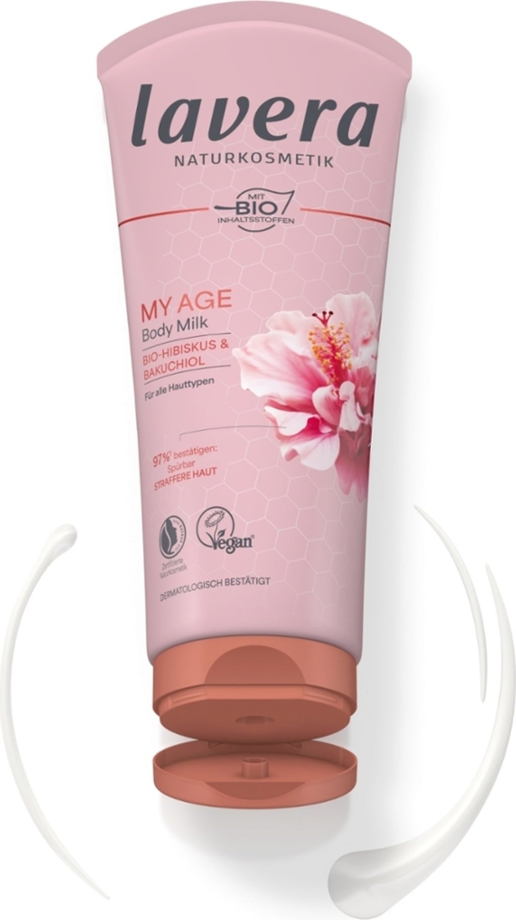 Mlijeko za tijelo My Age karakterizira nježna formula s hibiskusom i bakuchiolom. Ne samo da koži pruža dugotrajnu hidrataciju, već nudi i učvršćujuća svojstva. Njegova tekstura se brzo upija bez masnog ostatka, ostavljajući kožu baršunasto mekom i podatnom, a istovremeno je obavija cvjetnim mirisom.