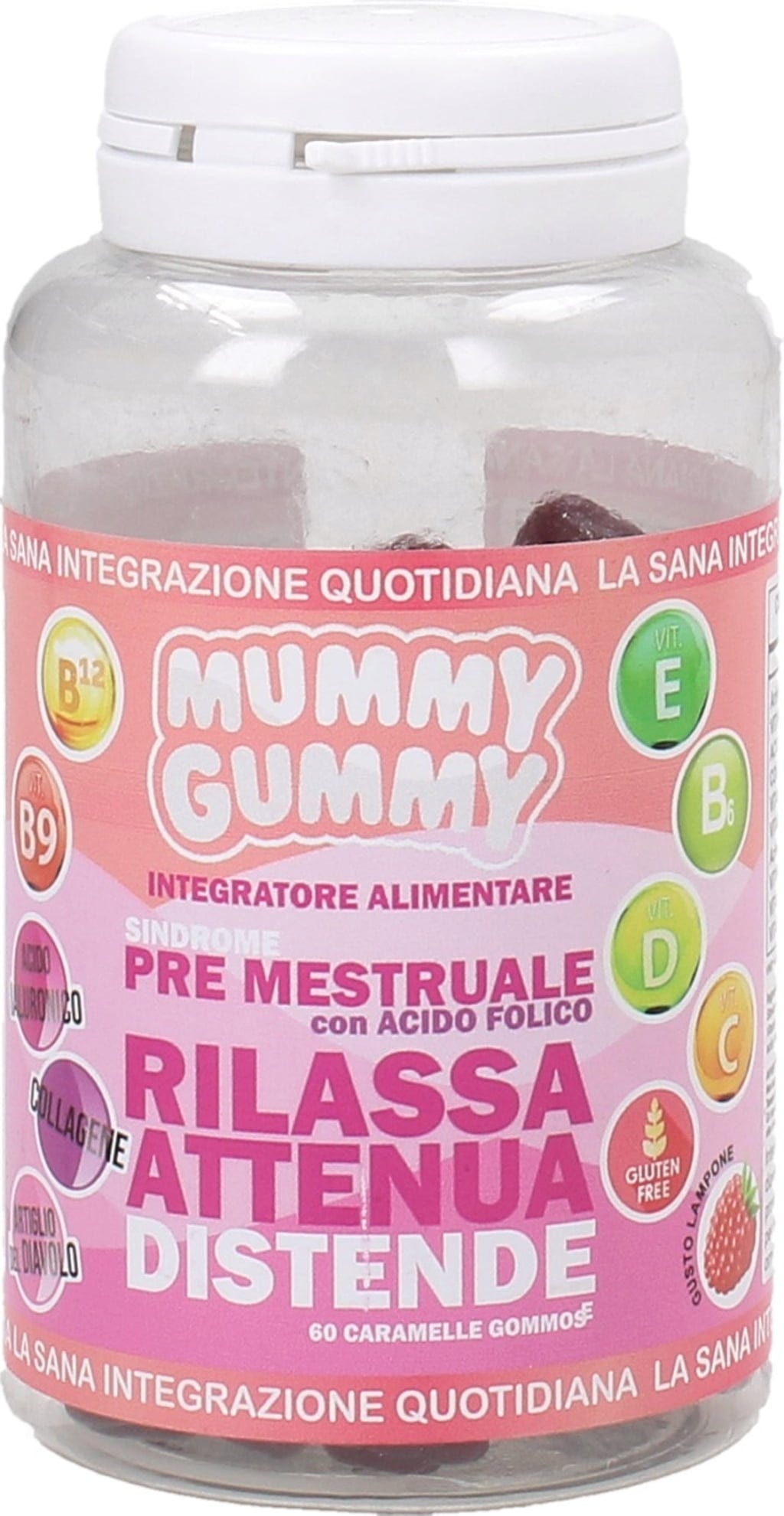 PMS gumeni bomboni brenda Mummy Gummy mogu poslužiti kao podrška vašem menstrualnom ciklusu. Gumeni bomboni obogaćeni su triptofanom, dragocjenim vitaminima, željezom, kolagenom i hijaluronom te imaju voćni okus maline.