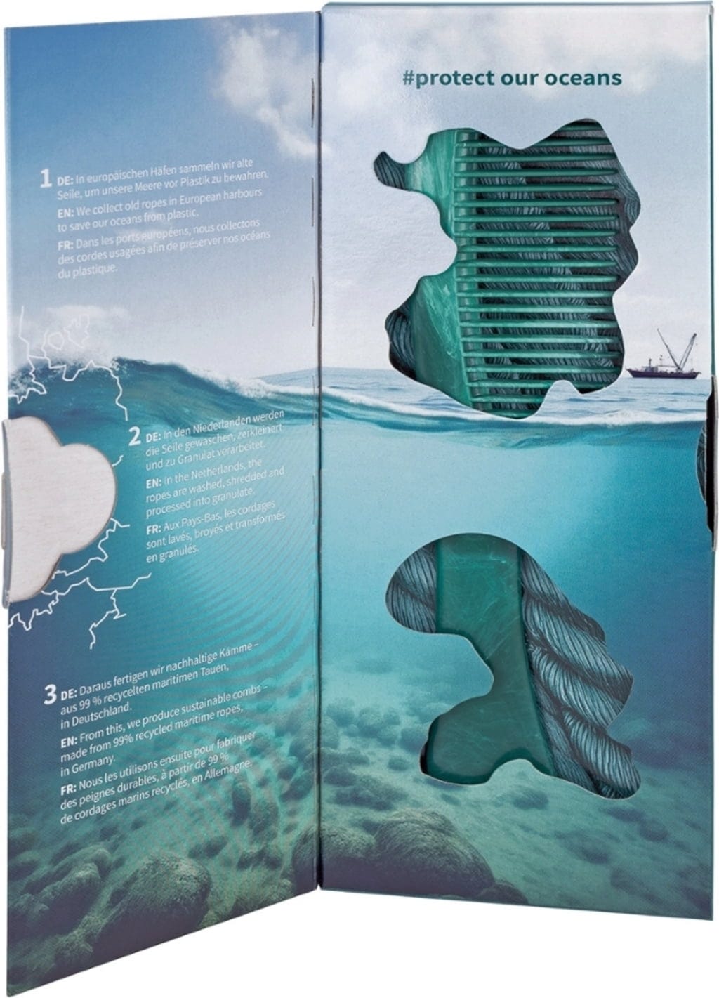 Češalj s drškom od reciklirane užadi izvrstan je za češljanje i oblikovanje kose svih duljina i tipova. Zahvaljujući zaobljenim zupcima, češalj nježno klizi kroz kosu, otpetljava čvorove i ostavlja ju sjajnom. Ergonomska drška pritom osigurava ugodno rukovanje prilikom oblikovanja i njege.