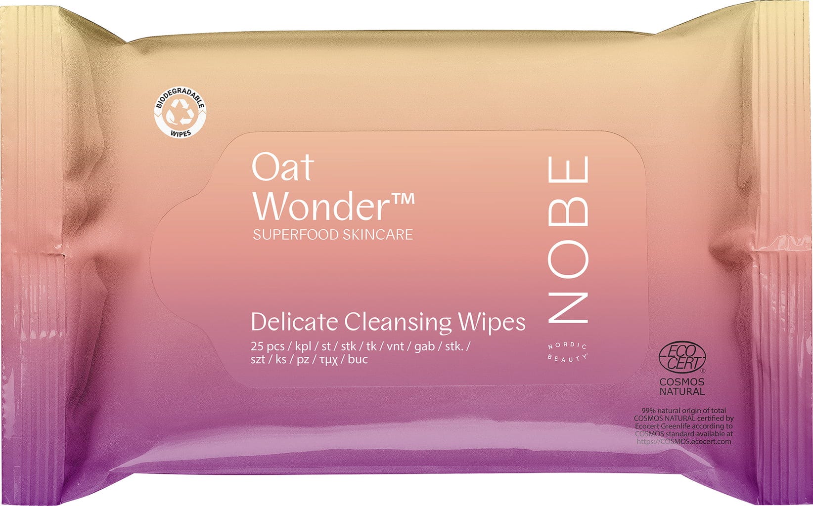Oat Wonder® Delicate Cleansing Wipes tvrtke NOBE su biorazgradive maramice za čišćenje koje nježno, a bez napora oslobađaju lice od nečistoća te uklanjaju šminku. Obogaćene organskim uljem nordijske zobi, maramice pružaju i njegujući učinak te ublažavaju iritacije. Zobeno ulje bogato je masnim kiselinama, vitaminom E i ceramidima koji hrane kožu, štite od slobodnih radikala i jačaju kožnu barijeru. U kombinaciji s izrazito hidratantnim glicerinom i jačajućim ksilitolom, maramice svim tipovima kože osiguravaju hidratiziran i osvježen osjećaj. Natopljene su s točno odgovarajućom količinom tekućine, pa klize po licu bez potrebe za trljanjem. Ambalaža s ponovnim zatvaranjem idealna je za užurbani način života, pogodna je za korištenje u teretani, na putovanjima ili za brzo uklanjanje šminke.