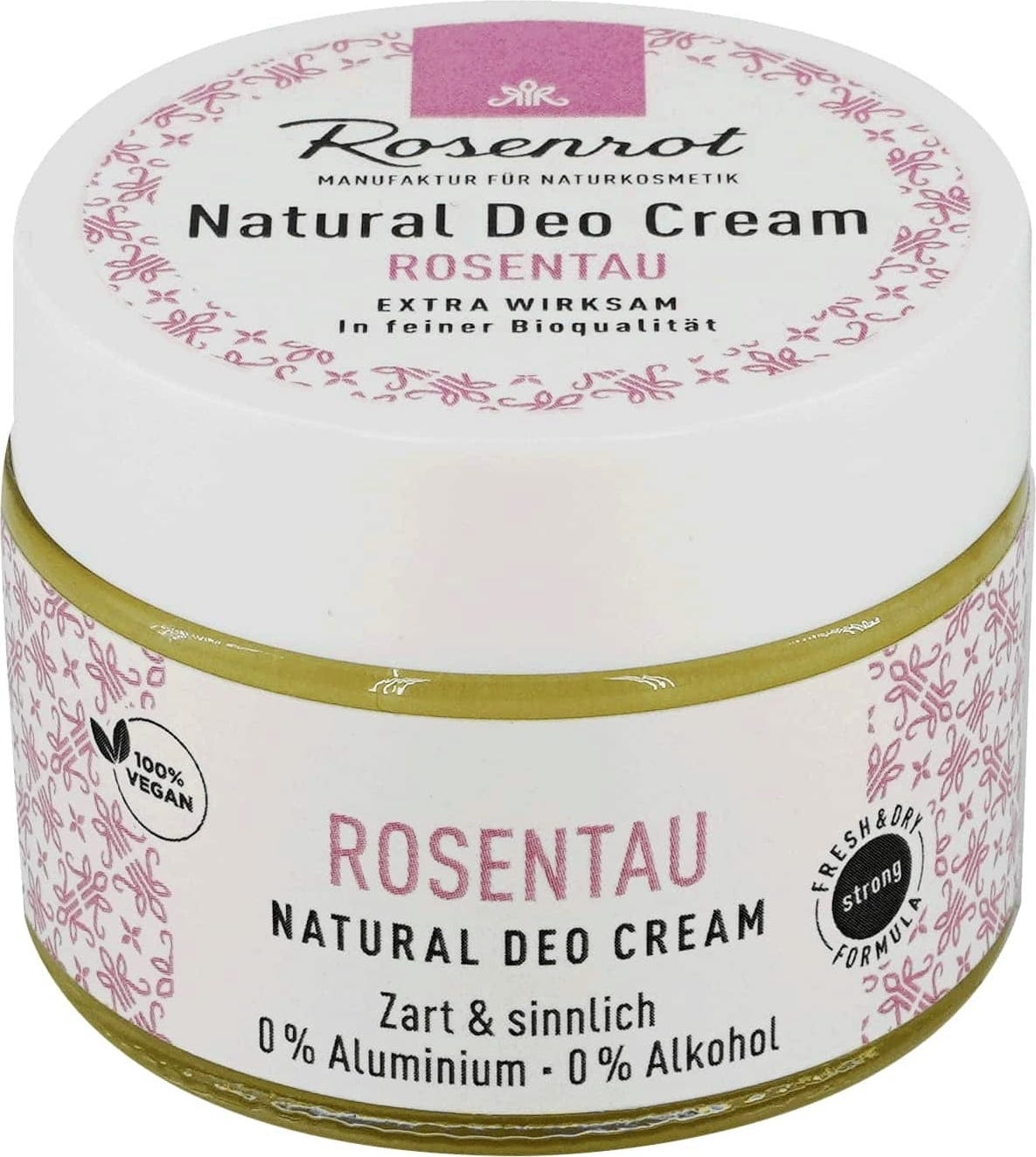 Rosenrot posvećuje pažnju 100% prirodnim tvarima i koristi sodu bikarbonu u dezodorans kremi kao učinkovitu zaštitu od znojenja. Sadržani shea maslac i kokosovo ulje pružaju umirujuća i hidratantna svojstva. Među različitim varijantama mirisa postoji ponešto za svakoga, a praktična veličina prigodna je za svaku torbicu.