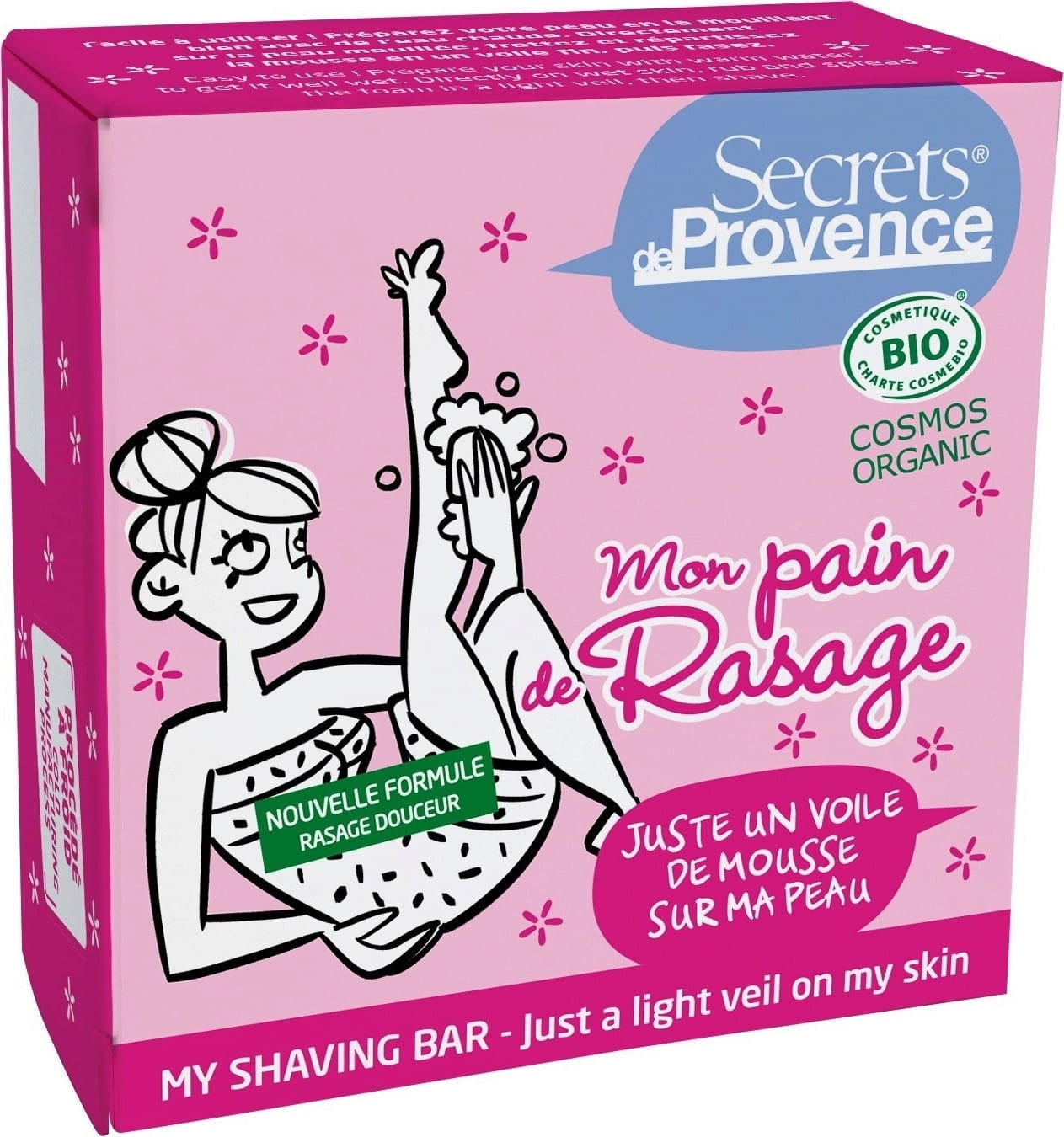 Ovaj inovativni proizvod marke Secrets de Provence čvrsti je blok za brijanje koji s vodom stvara meku, svilenkastu pjenu. Njegova iznimno nježna formula sadrži organski glicerin, organski shea maslac i organsku aloe veru. Praktičan format bloka za brijanje omogućuje brzu i jednostavnu upotrebu. Kremasta pjena također održava kožu prekrasno mekom i sprječava iritacije.