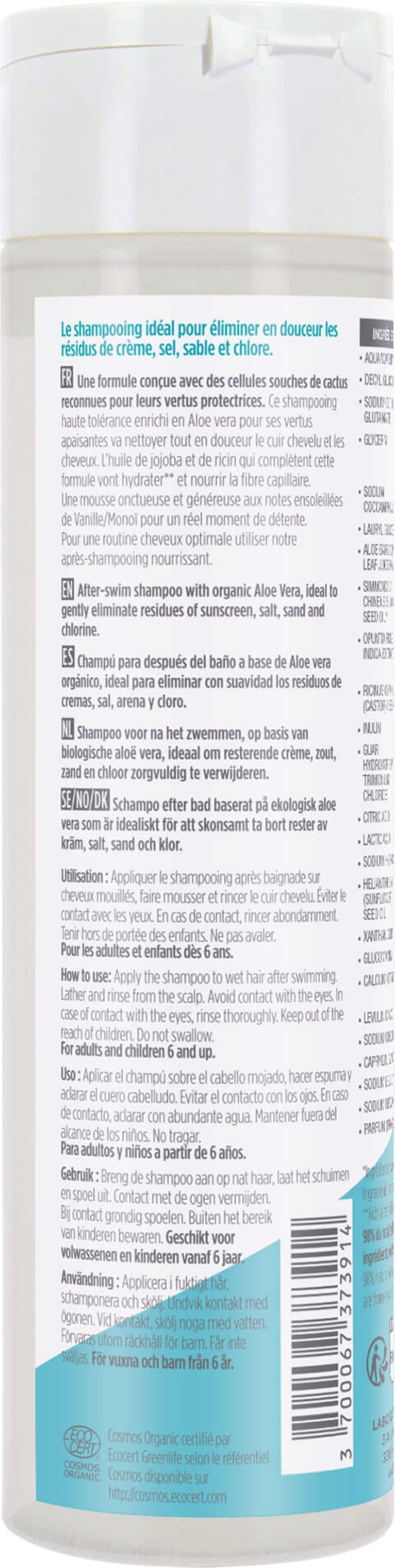 Ovaj šampon za poslije sunčanja posebno je formuliran za nježno čišćenje kose od soli, klora, pijeska i ostalih ostataka nakon ljetnog dana. Njegova formula sadrži zaštitne matične stanice kaktusa, odabrana biljna ulja i aloe veru za njegu i optimalno vlaženje vlakana kose. Stvara gustu, kremastu pjenu s aromama vanilije i monoija za apsolutni trenutak opuštanja pod tušem.