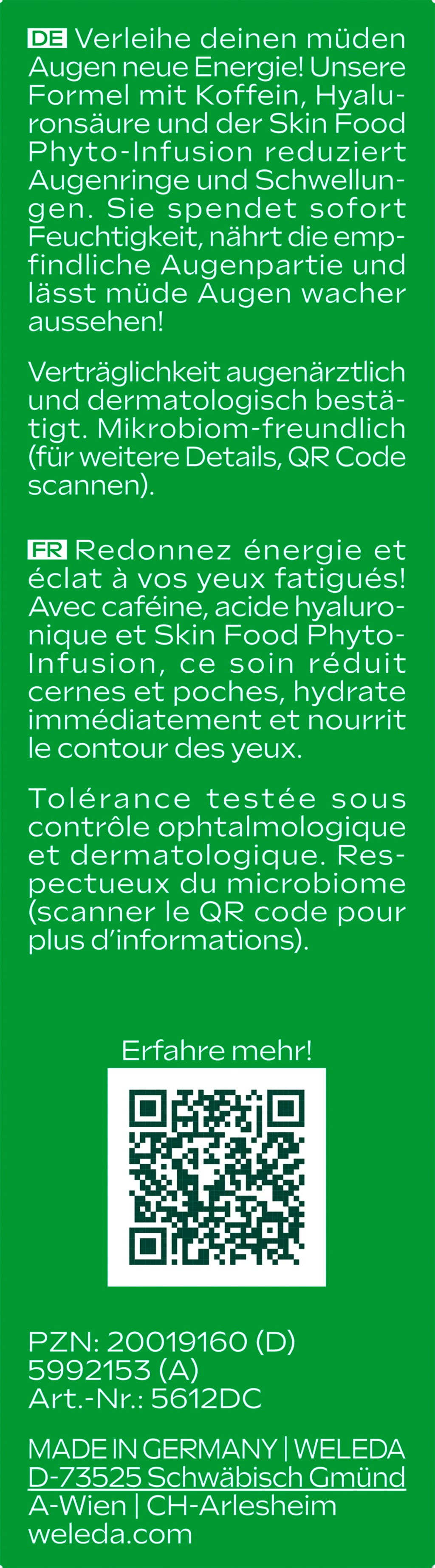 Skin Food Super krema za područje oko očiju pruža novu energiju umornim očima. Formula s kofeinom, hijaluronskom kiselinom i Skin Food Phyto-Infusion hidratizira i hrani osjetljivu kožu. Za svježije područje oko očiju!